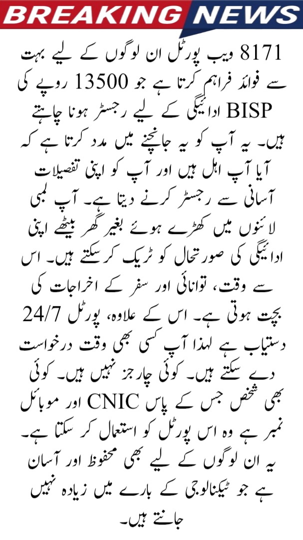 The 8171 Web Portal gives many benefits for people who want to register for the Rs 13500 BISP payment. It helps you check if you are eligible and also lets you register your details easily. You can track your payment status at home, without standing in long lines. This saves time, energy, and travel expenses. Also, portal is available 24/7 so you can apply anytime. There are no charges. Anyone with a CNIC and mobile number can use this portal. It is safe and simple to use even for people who do not know much about technology.