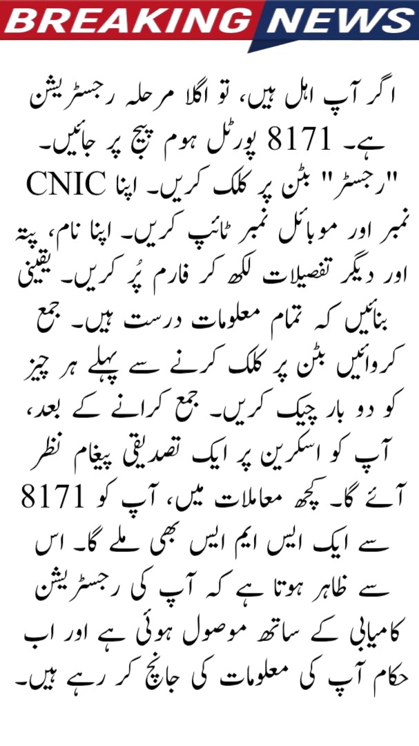 If you are eligible, the next step is registration. Go to the 8171 portal homepage. Click on the “Register” button. Type your CNIC number and mobile number. Fill out the form by writing your name, address, and other details. Make sure all information is correct. Double-check everything before clicking the submit button. After submitting, you will see a confirmation message on the screen. In some cases, you will also get an SMS from 8171. This shows that your registration has been received successfully and your information is now being checked by the authorities.