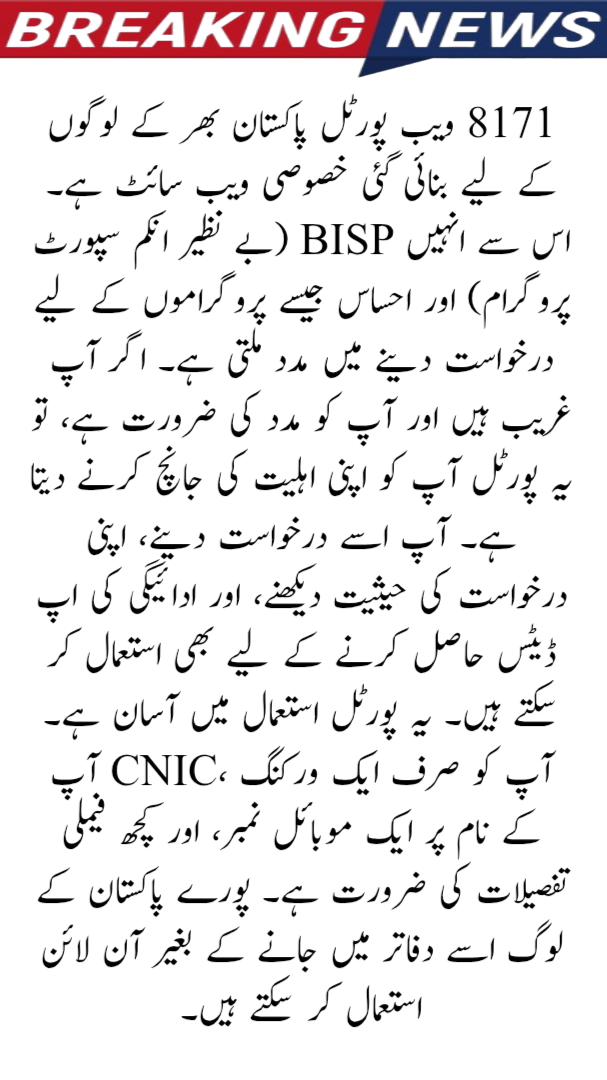 The 8171 Web Portal is special website made for the people across Pakistan. It helps them apply for programs like BISP (Benazir Income Support Programme) and Ehsaas. If you are poor and need help, this portal lets you check your eligibility. You can also use it to apply, see your application status, and get payment updates. This portal is simple to use. All you need is a working CNIC, a mobile number in your name, and some family details. People from all over Pakistan can use it online without going to offices.