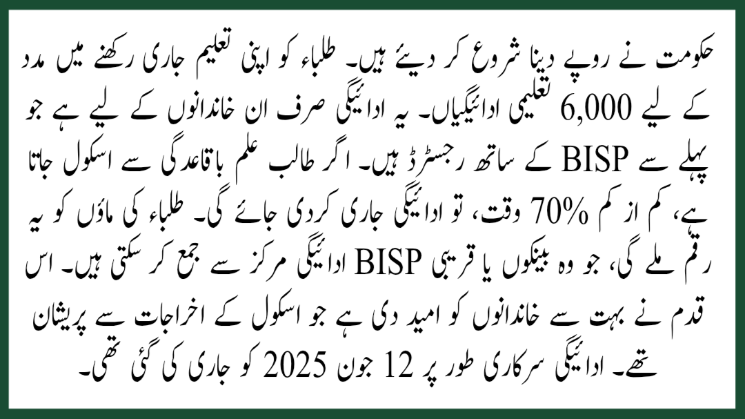 The government has started giving Rs. 6,000 education payments to help students continue their studies. This payment is only for families already registered with the BISP. If the student attends school regularly, at least 70% of the time, then the payment will be released. Mothers of the students will receive the money, which they can collect from banks or the nearest BISP payment center. This step has given hope to many families who were worried about school expenses. The payment was officially released on June 12, 2025.