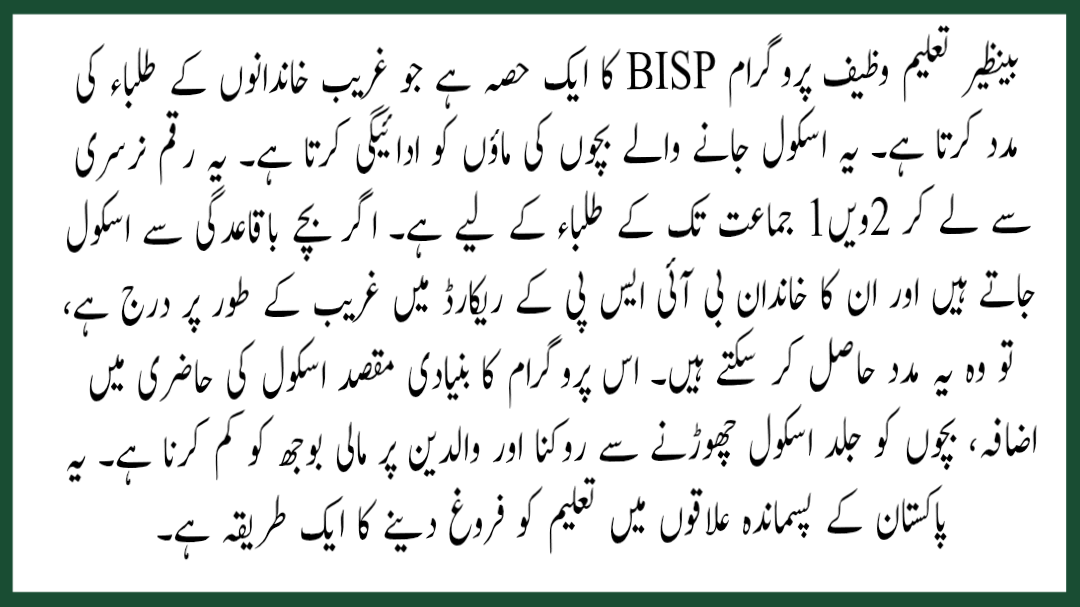 The Benazir Taleemi Wazaif program is a part of the BISP that helps students from poor families. It gives payment to mothers of school-going children. The money is for students from nursery up to class 12. If children attend school regularly and their family is listed as poor in the BISP records, they can get this help. The main aim of this program is to increase school attendance, stop children from leaving school early, and reduce the financial burden on parents. It is a way to promote education in Pakistan’s underprivileged areas.