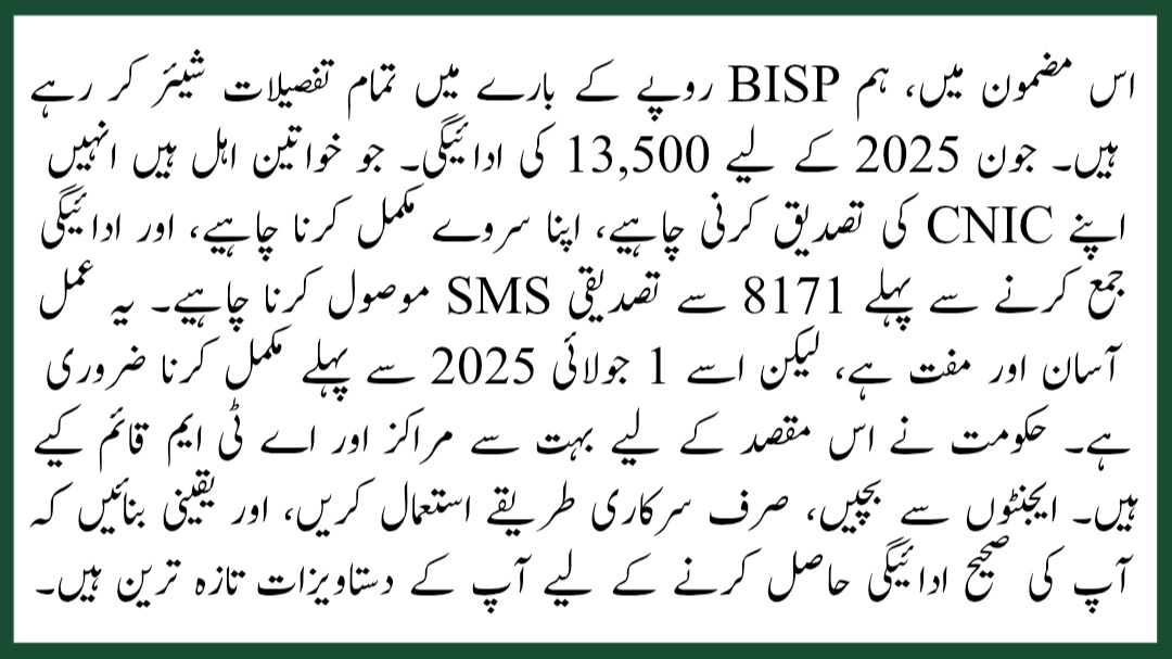 In this essay, we are sharing all the details about the BISP Rs. 13,500 payment for June 2025. Women who are eligible must verify their CNIC, complete their survey, and receive a confirmation SMS from 8171 before they can collect the payment. The process is easy and free, but it must be completed before July 1, 2025. The government has set up many centers and ATMs for this purpose. Avoid agents, use only official methods, and make sure your documents are up to date to get your rightful payment.