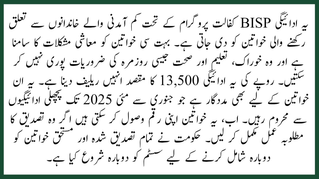 This payment is given under the BISP Kafalat Program to women who belong to low-income families. Many women are facing economic difficulties and cannot meet daily needs like food, education, and health. This payment of Rs. 13,500 is meant to give them relief.It is also helpful for those women who missed previous payments from January to May 2025. Now, these women can receive their amount if they complete the required verification process. The government has restarted the system to include all verified and deserving women again.