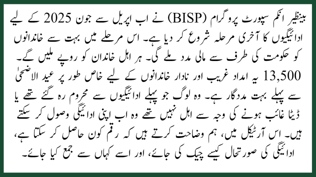 The Benazir Income Support Programme (BISP) has now started the final phase of payments for April to June 2025. In this phase, many families will get financial help from the government. Each eligible family will receive Rs. 13,500. This support is very helpful for poor and needy families, especially before Eid-ul-Adha. People who missed earlier payments or were not eligible due to missing data can now receive their payment. In this article, we explain who can get the money, how to check payment status, and where to collect it.
