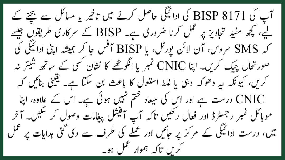 To avoid delays or problems in receiving your BISP 8171 payment, it is important to follow some helpful tips. Always check your payment status using official BISP methods such as the SMS service, the online portal, or by visiting a BISP office. Do not share your CNIC number or thumbprint with anyone, as this can lead to fraud or misuse. Make sure CNIC is valid and not expired. Also, keep your mobile number registered and active so you can receive official messages. Lastly, visit the correct payment center and follow the instructions given by the staff for a smooth process.