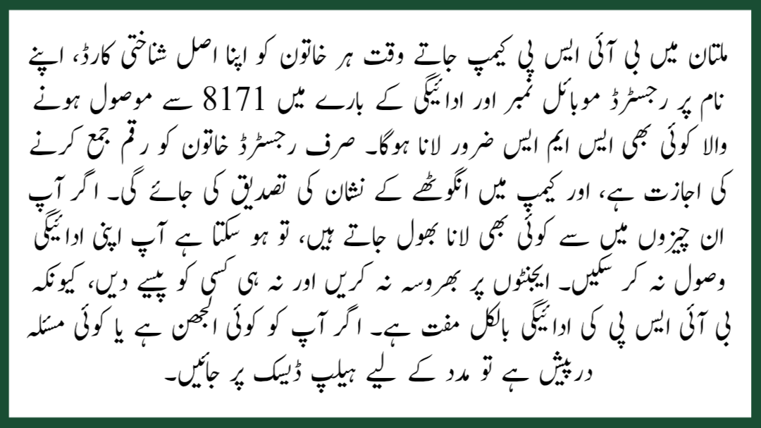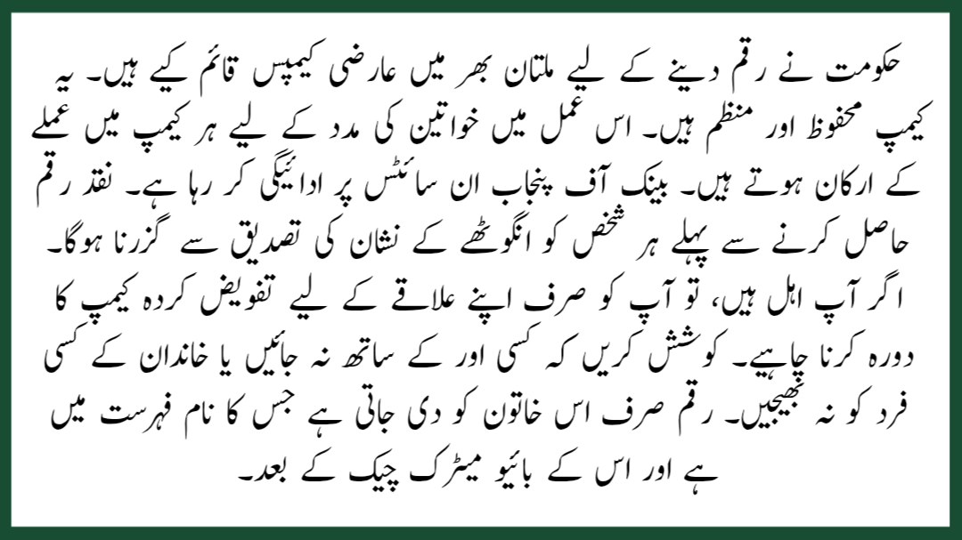 The government has set up temporary campsites across Multan to give out the money. These camps are safe and organized. Each camp has staff members to help the women with the process. The Bank of Punjab is giving the payment at these sites. Every person has to go through thumbprint verification before receiving the cash. If you are eligible, you should visit only the camp assigned to your area. Try not to go with someone else or send a family member. The money is only given to the woman whose name is on the list and after her biometric check.