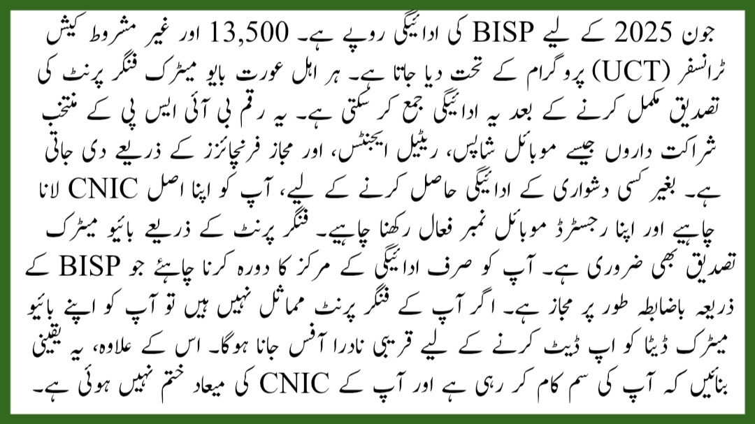 The BISP payment for June 2025 is Rs. 13,500 and is given under the Unconditional Cash Transfer (UCT) program. Every eligible woman can collect this payment after completing biometric fingerprint verification. The money is handed out through selected BISP partners like mobile shops, retail agents, and authorized franchises. To receive the payment without any problem, you must bring your original CNIC and have your registered mobile number active. Biometric verification through fingerprint is also required. You should only visit a payment center that is officially authorized by BISP. If your fingerprint does not match, you need to go to the nearest NADRA office to update your biometric data. Also, make sure your SIM is working and your CNIC is not expired.