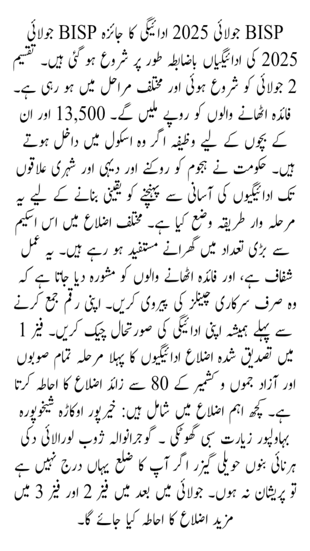 The Benazir Income Support Program (BISP) has started releasing its new payment installment for July 2025. Registered families can now collect their Rs. 13,500 payment from official collection centers. Taleemi Wazaif for school-going children is also included in this phase. In this article, we explain the full process, from checking payment status to where and how to collect your amount. If you are eligible or recently registered, read carefully to avoid any mistakes.