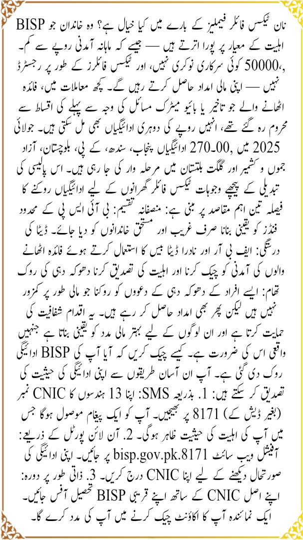 - Tax Filer in Family: If payment stopped due to a tax filer, verify with FBR and provide supporting documents to BISP.