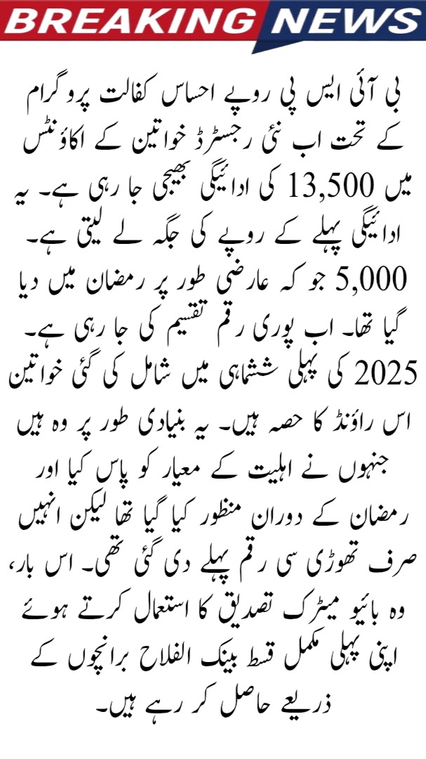 The BISP Rs. 13,500 payment is now being sent to the accounts of newly registered women under the Ehsaas Kafalat program. This payment replaces the earlier Rs. 5,000 that was temporarily given during Ramadan. Now, the full amount is being disbursed. Women who were added in the first half of 2025 are part of this round. These are mainly those who passed the eligibility criteria and were approved during Ramadan but were only given a smaller amount earlier. This time, they are getting their first complete installment through Bank Alfalah branches using biometric verification.