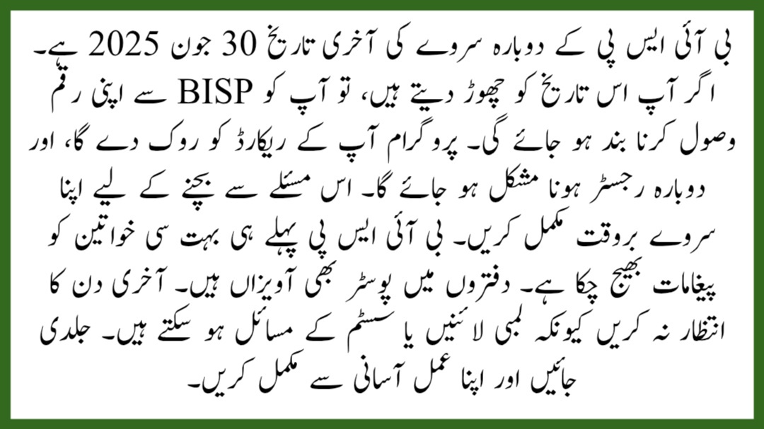 If you do not complete the re-survey by 30 June 2025, your quarterly payment of Rs. 13,500 will be stopped. The BISP database will automatically block your status. There will be no extra time after the deadline. This rule is for all women who have crossed three years of receiving help.