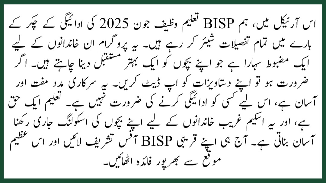 In this article, we are sharing all the details about the BISP Taleemi Wazaif June 2025 payment cycle. This program is a strong support for families who want to give their children a better future. Update your documents if needed. This government help is free and simple, so there is no need to pay anyone. Education is a right, and this scheme makes it easier for poor families to continue their children’s schooling. Visit your nearest BISP office today and take full benefit of this great opportunity.
