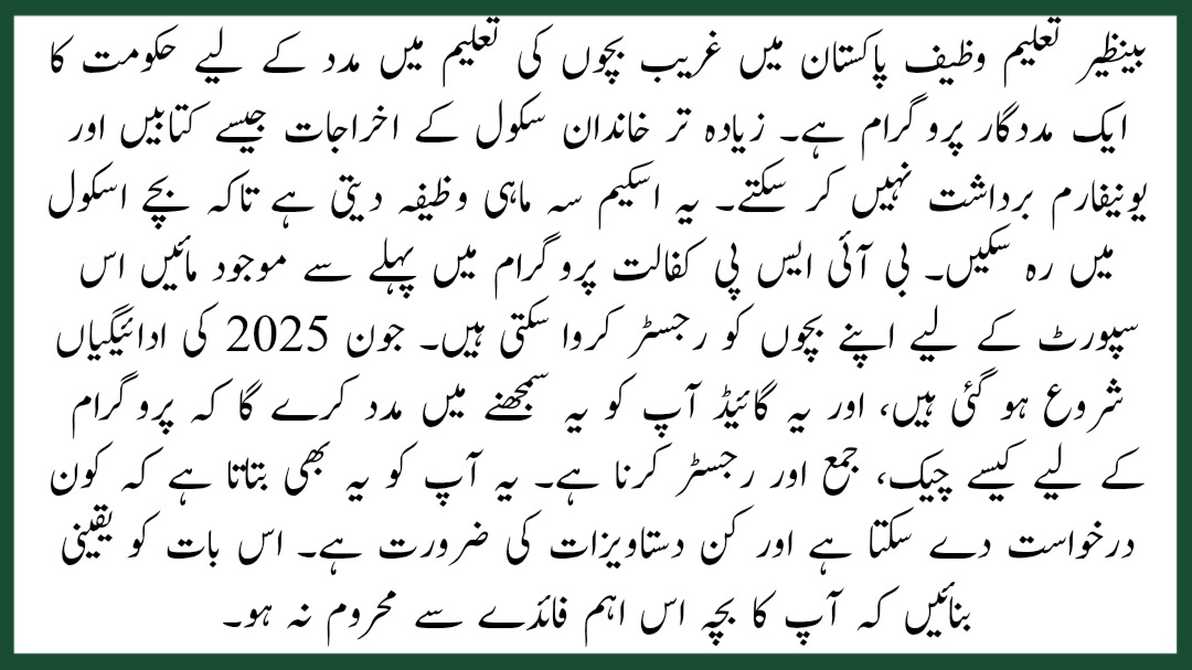 This program gives financial help to children whose mothers are registered in the BISP Kafalat program. The aim is to make sure children from poor homes continue their education. It is also designed to help girls stay in school longer, especially in rural areas where dropout rates are high.