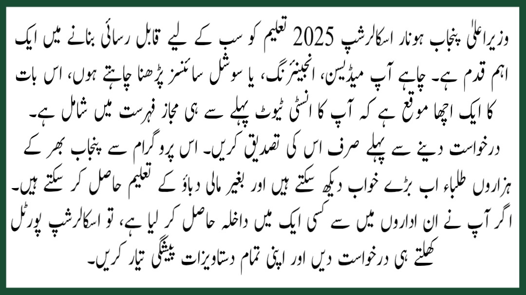 The CM Punjab Honhaar Scholarship 2025 is a major step in making education accessible for all. Whether you want to study medicine, engineering, or social sciences, there is a good chance your institute is already on the authorized list. Just confirm it before applying. With this program, thousands of students across Punjab can now dream bigger and study without financial pressure. If you’ve secured admission in one of these institutes, apply as soon as the scholarship portal opens and prepare all your documents in advance.