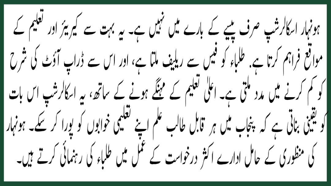The Honhaar Scholarship is not just about money; it gives many career and education opportunities. Students get relief from fees, and it helps reduce the dropout rate. With higher studies becoming expensive, this scholarship makes sure every capable student in Punjab can chase their academic dreams.Scholarships may cover tuition fees, hostel allowance, books, and sometimes monthly stipends. Institutes with Honhaar approval often guide students through the application process.