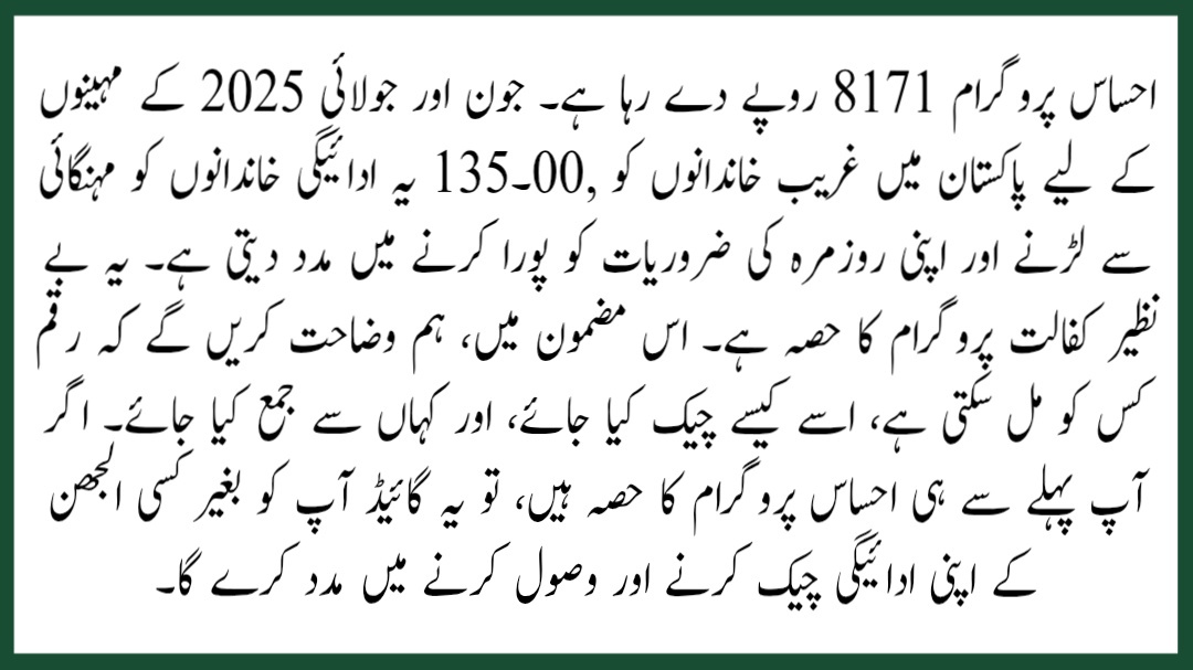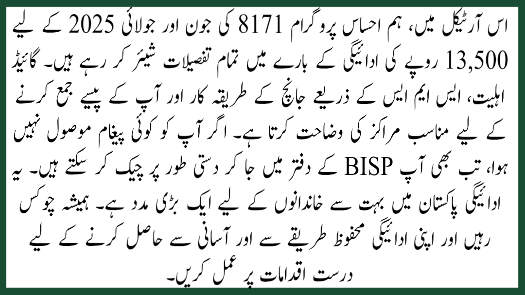 In this article, we are sharing all the details about the Ehsaas Program 8171 payment of Rs 13,500 for June and July 2025. The guide explains the eligibility, checking method using SMS, and the proper centers to collect your money. If you did not receive a message, you can still check manually by visiting a BISP office. The payment is a great help for many families in Pakistan. Always stay alert and follow the correct steps to get your payment safely and easily.