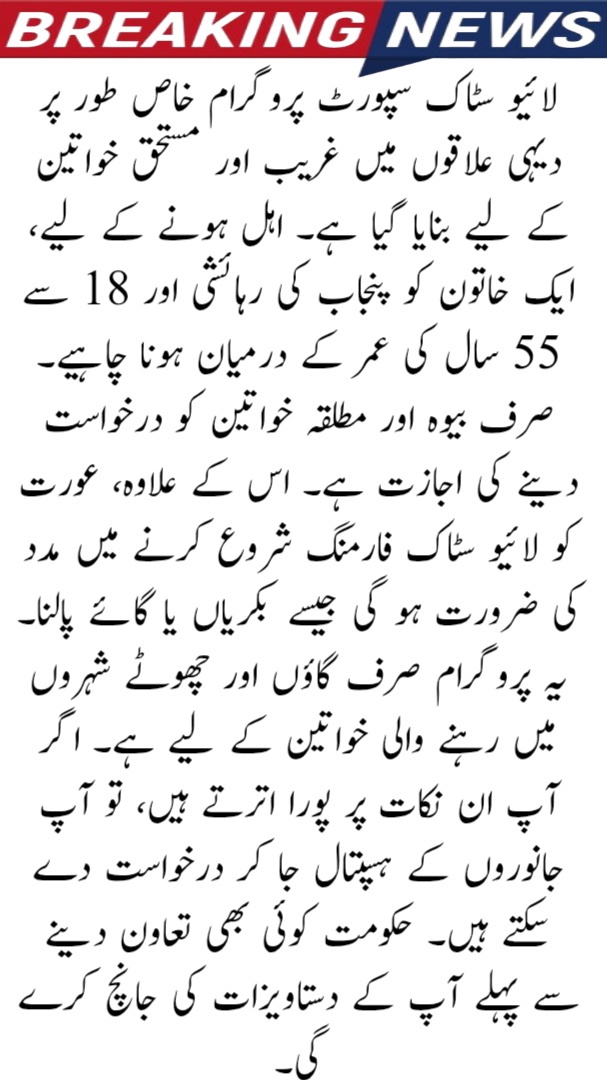 The Livestock Support Program is specially made for poor and deserving women in rural areas. To be eligible, a woman must resident of Punjab and be between 18 and 55 years of age. Only widows and divorced women are allowed to apply. Also, the woman must need help in starting livestock farming such as raising goats or cows. The program is only for women living in villages and small towns. If you meet these points, then you can go to the animal hospital and apply. The government will check your documents before giving any support.