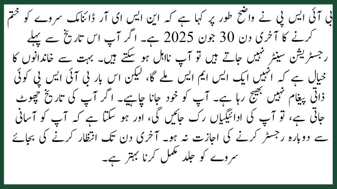 BISP has clearly said that the last day to finish the NSER Dynamic Survey is June 30, 2025. If you do not visit the registration center before this date, you may become ineligible. Many families think they will get an SMS, but this time BISP is not sending any personal messages. You must go yourself. If you miss the date, your payments will stop, and you may not be allowed to register again easily. It is better to complete the survey early instead of waiting till the last day.