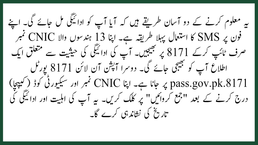 There are two easy ways to find out if you will receive the payment. Using SMS on your phone is the first method. Send your 13-digit CNIC number to 8171 by simply typing it. A notification regarding the status of your payment will be sent to you. The second option is to go to 8171.pass.gov.pk, the online 8171 portal. Click “Submit” after entering your CNIC number and the security code (captcha). This will indicate your eligibility and the date of payment.