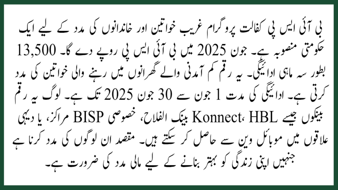 The BISP Kafalat Program is a government plan to help poor women and families. In June 2025, BISP will give Rs. 13,500 as a quarterly payment. This money supports women who live in low-income households. The payment period is from June 1 to June 30, 2025. People can get this money from banks like HBL Konnect, Bank Alfalah, special BISP centers, or mobile vans in rural areas. The goal is to help those who need financial support to improve their lives.